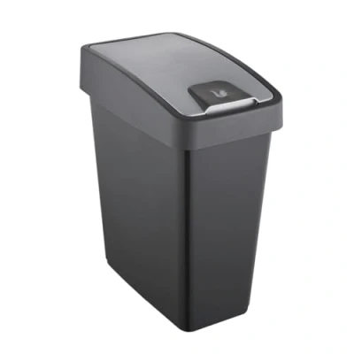 Compact premium waste container with 2-way opening option and 25 l capacity - For waste bags with a volume of 30 - 35 litres Convenient waste disposal: Lid can be hinged upwards and swivelled downwards, Pleasant soft-touch grip surface for ease of use Discreet design with colour-contrasting lid and keeeper trademark integrated in the handle, Easy to clean: Lid can be completely removed, wipe with a damp cloth or sponge Made in Europe, High-quality, stable plastic (PP), No release of harmful substances