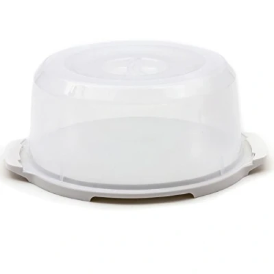 Practical cake container consisting of cover and serving tray - Ideal for storing and transporting cakes up to 11 cm high and other pastries Secure closure with snap-in-function by turning of lid, Easy lifting and placing of lid with integrated handle Safe transport thanks to lateral carrying handles, Even cutting of the cake thanks to practical portioning guide on the serving tray Made in Europe, Sturdy plastic (PP), No pollutant release, Easy cleaning: dishwasher-safe Contents: 1 Keep-Fresh Cake Container, 10468, Dimensions (ØxH): 37 x 15 cm, Colour: white/transparent Dimension: 37x37x15cm Keep the cakes fresh Dishwasher safe