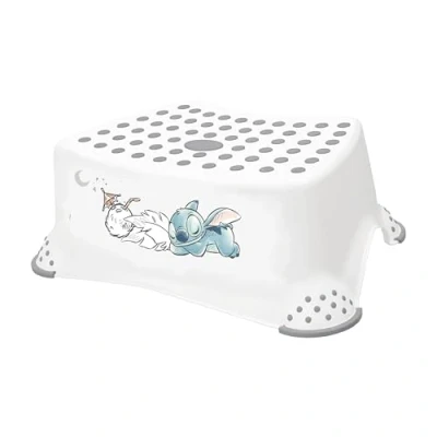 Single-step stool with Disney's Stitch license for children aged approximately 3 to 14 years, for climbing and sitting securely – Ideal for reaching the sink or toilet. Child-safe: It does not tip over or slip thanks to the non-slip system with rubber feet, remains stable and secure on the surface thanks to the rubber pads. Stitch or Experiment 626 design from the movie Lilo & Stitch firmly integrated into the material, matches other keeeper products from the series, easy to clean: wipe with a damp cloth or sponge. Manufactured in Europe, High-quality, stable plastic (PP/TPE), Does not release harmful substances, Load capacity up to a maximum of 80 kg, Easy to transport thanks to its reduced weight. Scope of delivery: 1 stool Tomek, one step, Stitch decor, item 18431, dimensions (LxWxH): 40.5 x 28.5 x 14 cm, step dimensions: 32 x 20 x 14 cm, weight: 514 g, color: white.