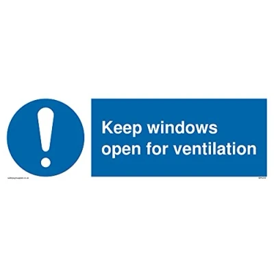 M001 : General mandatory action This sign is made from vinyl high tack A stickier sticker. Uses a stronger adhesive to make it more suitable for plastic surfaces like Wheelie Bins or where the sticker might get rubbed. 31 landscape Sign Text: Keep windows open for ventilation