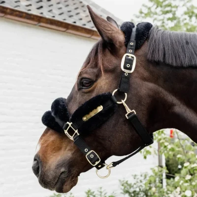 Even more stylish and comfortable, the Nylon Sheepskin Halter Soft gives your horse an extremely chic look thanks to the artificial sheepskin. - Strong nylon halter covered with vegan sheepskin (100% animal-friendly) - Easy to open and close thanks to the carabine hook on the cheek - Perfect for transport or sensitive horses - Anatomically shaped around the nose and behind the ears What’s special The Nylon Sheepskin Halter Soft is even more stylish and provides even more comfort for the horse. The extra wide pieces of artificial sheepskin on the nose, behind the ears and on the cheeks make this halter perfect for sensitive horses or during transport. Fabrics & materials The halter is made of nylon. On the nose, behind the ears, and on the cheeks, artificial sheepskin is sewn onto the nylon. The halter features a gold-coloured plate with our engraved logo. This plate can be turned around and engraved with your horse's name. All the buckles are gold-coloured and therefore match our leads perfectly. Shape & size The halter is anatomically shaped around the nose and behind the ears. Thus, the pressure on the horse's head is better distributed. The size of the halter can be adjusted on both sides. The small carabine hook on the cheek makes it easy to remove the halter. Care guide Machine Washable Most of our products are machine washable at 30 degrees. However, we recommend washing it as infrequently as possible and using our protective washing bags in order to maintain quality over the long term. We also recommend using professional machines (larger capacity) to limit damage due to the drum of the normal washing machine. To dry it, simply put it outside on a sunny day. The dryer is not recommended.