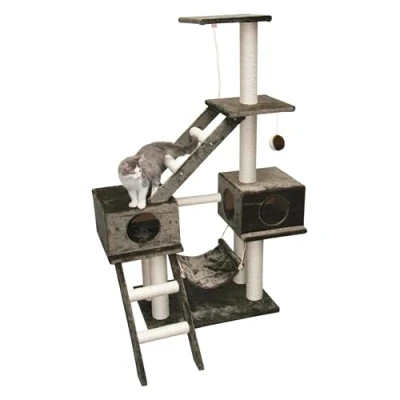 Cat scratching tree granat Sisal is glued to the post Measures 70 cm length by 50 cm width by 150 cm height Grey colour Attractive climbing tree with 2 hiding places, 2 sisal stairs and 1 hammock