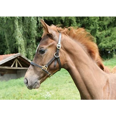 hardwearing leather halter in harmony with the foal's needs: narrow leather strapping, light but durable fittings, easy to adjust genuine leather