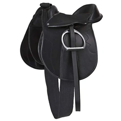 Complete set consisting of saddle, cotton saddle strap, stirrups and stirrup straps. High-quality synthetic saddle. Non-slip seat cover for perfect grip in the saddle. Saddle cushion can be adjusted individually using Velcro fasteners. Knee pads can be detached and moved for an optimal sitting position using the Velcro fastener.