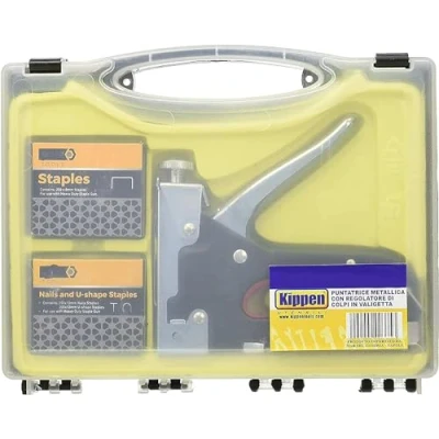 Equipped with manual d,u,t stitches,ideal for repair, decoration and fixing to meet different renovation needs With safety device and ergonomic non-slip handle For upholstery work and for attaching to wood Plastic case