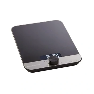 What You'll Get - KitchenAid digital glass kitchen scales for dry and liquid ingredients Unique Rotating Knob - Inspired by KitchenAid countertop electric ovens, twist to set the units of measurement and push to tare or power on/off Tare Feature - Weigh all ingredients into one container by using the tare feature to zero out between additions. Also works to zero the weight of any container before adding Durable & Easy to Clean - Tempered glass surface wipes up quickly and will not stain or retain food odours. Hand wash only. For best results, wipe with a damp cloth and dry thoroughly Battery Powered - Three (3) AAA batteries, not included. Scale can be powered off or will auto shut-off after 3 minutes of no change in weight on the platform