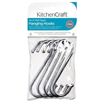 ORGANISE YOUR SPACE: add extra storage to utensil racks, shelving units and more, with these simple, stylish hanging hooks ROBUST AND ATTRACTIVE: these sturdy metal S hooks can handle heavy items, and have a chrome plating that's ideal for display SAFE AND SECURE: ball shaped tips stop items slipping, and mean no sharp points (an important consideration if you have kids) NO INSTALLATION NECESSARY: simply hang onto existing racks or rails WHAT'S INCLUDED: you get 5 in the set, each measuring 13 cm (5"); they come with a 12 month guarantee