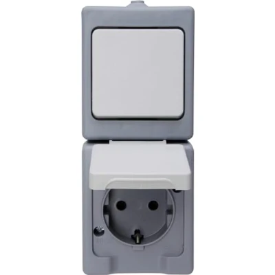 Surface-mounted switch range standard IP 44: suitable for basements, garages and workshops, characterised by easy handling and robust shape Grey Extremely practical socket and toggle switch combination Vertical mounting