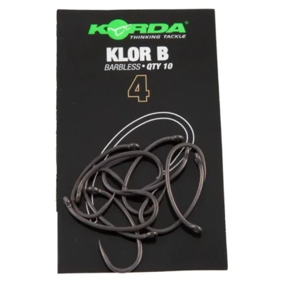 The Korda Klor Barbless Hooks are available in several variants and were designed by Danny Fairbrass. This barbless hook has an aggressive, strong and fast spinning shape with great hooking characteristics. It can be used with many different rigs. Produced by one of the best Japanese hook manufacturers it is exceptionally strong. The hook has proven itself under the most extreme conditions at home and abroad. The Klor has a very aggressive shape (even more so than the Kurv Shank hook), with the hook point being in line with the eye. This ensures, among other things, that the hook turns quickly and finds a hold in the mouth of a carp. The bending of the shank and the inward curve of the eye allow the hook to be used without the use of shrink tubing or a kicker and without having to worry about the hook bending open. During testing Danny landed carp up to over 60lbs from open French waters that were full of obstacles. Despite the thickness of the wire the point remains very sharp and the barb ensures the hook stays in place! This hook is multifunctional!