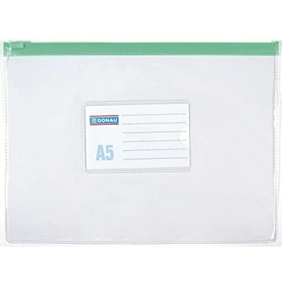 rigid; made of durable PVC with a thickness of 170μm;; colour: clear (transparent) crystal clear, transparent;; plastic zip; opening along the longer edge; for holding small accessories or A5 documents; size: 180x240mm