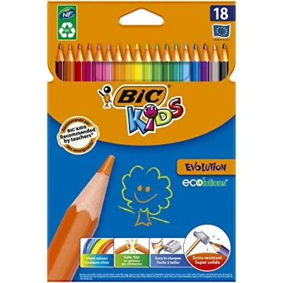 AmazonThe hexagonal colourful pens are ideal for children aged 5 and over. Ideal for everyday drawing and painting in kindergarten, school or on the go Coloured pencils without wood, made from 50% recycled material / no splintering when violent breakage - shatterproof, extremely durable lead The pens have the same barrel as font colour, which allows easy identification of the desired colour - for effortless colouring fun! No chipping from the paint when chewing the colouring pencil. The colouring pencils for children comply with the European standard for the safety of toys (EN 71) Box contents: children's pen set by BIC Kids, safe colouring fun with 18 vibrant colours, easy to sharpen, in a practical cardboard case