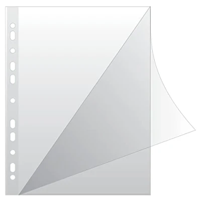 document pockets made of thick, eco-friendly polypropylene foil (150 microns); crystal clear;; top and long side open (L-type) suitable for A4 documents;; 50pcs in sales unit number of punches: 11; dimensions: 233x337mm colour: clear (transparent)