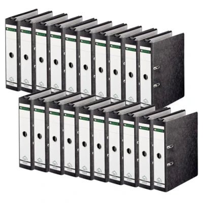 20 x hanging folders (black), for hanging vertically, unfolded and for standing, spine width 8 cm, for storing approx. 500 sheets (80 g/m²) Glued spine label, individual design of the labels thanks to Leitz EasyPrint on the Leitz homepage 50% further opening and 20% faster, double-sided filing thanks to stable, patented 180° precision mechanism, high closing force, on precision mechanism FSC certification, GS tested, Blue Angel, robust hard cardboard (RC), hanging swivel bracket made of plastic (POM), protects furniture thanks to non-scratching surface Box contents: 20 x Leitz hanging folders, black, 18210000, dimensions: 81 x 320 x 265 mm, A4