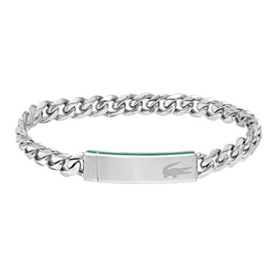 Chain bracelet for men by Lacoste Material: Stainless steel Inner circumference: 19 cm Embellished with an enamel green Stripe on the side of the plaque Closure: Magnetic
