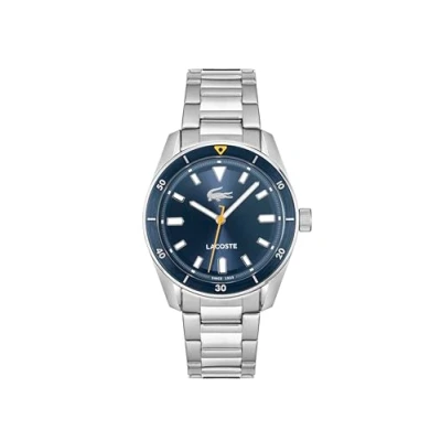 3-HAND QUARTZ MOVEMENT – Offers precise and reliable timekeeping with a clean, minimalist three-hand layout for everyday elegance. 39MM STAINLESS STEEL CASE – Durable silver-tone case with a 9 mm profile – the perfect balance of sporty design and refined aesthetics. BLUE DIAL WITH ALUMINUM BEZEL – Circular-brushed blue dial with the Lacoste logo and aluminum bezel for a confident and contemporary finish. SILVER-TONE STAINLESS STEEL BRACELET – Brushed H-link bracelet delivers durability, comfort, and timeless Lacoste elegance. WATER RESISTANCE: 5 ATM – READY FOR EVERYDAY MOMENTS – Designed to handle splashes, rain, and handwashing with ease. Not suitable for swimming or showering.