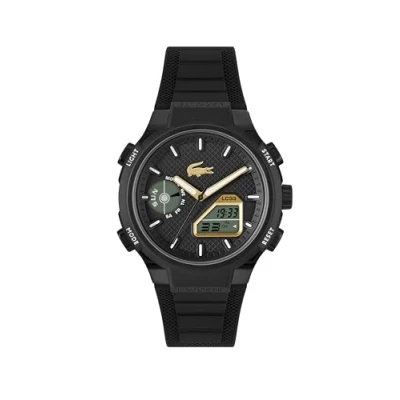 HYBRID ANALOG-DIGITAL MOVEMENT FOR MEN – The Lacoste LC33 blends analogue hands with digital screens featuring alarm, chronograph, and calendar functions for ultimate versatility. 45MM BLACK TR90 CASE – Durable, lightweight case crafted from shatter-resistant TR90 material, designed for bold everyday wear. BLACK TEXTURED DIAL WITH YELLOW GOLD DETAILS – The Lacoste LC33 showcases a bold black dial with petit piqué texture, yellow gold accents, and the iconic Lacoste crocodile at 12 o’clock. BLACK SILICONE STRAP WITH PETIT PIQUÉ EMBOSSING – Integrated, flexible black silicone strap featuring the signature Lacoste petit piqué texture for comfort and sporty style. 10 ATM WATER RESISTANT – BUILT FOR ACTION – Suitable for swimming, snorkeling, and water sports. Not suitable for diving. A fearless Lacoste men’s watch ready for any challenge.
