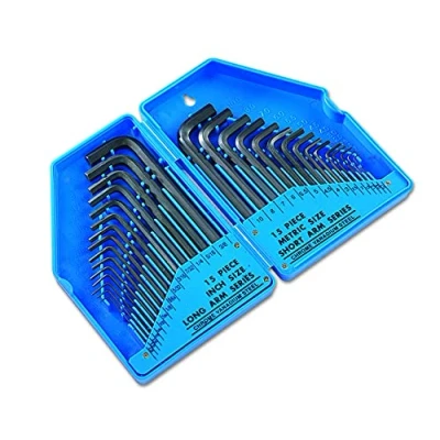 Metric sizes (short format): 07, 09, 13, 15, 2, 25, 3, 4, 45, 5, 55, 6, 7, 8, 10 mm Imperial sizes (long format) 0028", 0035", 0050", 1/16", 5/64", 3/3 2", 7/64", 1/8", 9/64", 5/32", 3/16", 7/32", 1/4", 5/16", 3/8", 1/4", 5/16", 3/8" Key length range: 45 - 130 mm Made from chrome vanadium with a black durable non-corrosive finish. . PA2023 2023 Complete with storage clip for safe storage