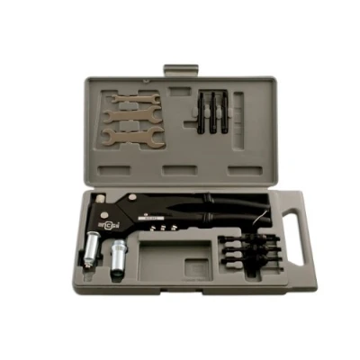 9 heads. Swivel head is great for accessing awkward fixings. Can be used on 2.4 | 4 | 4.8mm rivets, 4 | 5 | 6mm nut rivets and 4 | 5 | 6mm bolt rivets. Supplied in a blow mould case. Time saver.