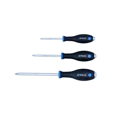 Japanese (JIS) cross-point head. Sizes: PH1 x 75 mm, PH2 x 100 mm, PH3 x 150 mm. Pound thru design can be struck with a hammer to release the fixing before and during application of torque. Hex shaft continues through handle for strength & impact resistance. Manufactured from chrome molybdenum with magnetic tips. From a range of JIS tools. Please see Part Nos. 7036 (screwdriver set), 7520 (T-handle bit), 7724 (Impact bit set).