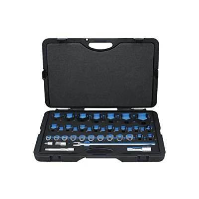3/8"D sizes: 10, 11, 12, 13, 14, 15, 16, 17, 18 & 19mm. 1/2"D sizes: 20, 21, 22, 23, 24, 25, 26, 27, 28, 30, 32, 33 & 36mm. 3/4"D sizes: 38, 41, 46 & 50mm. Also included: 1/2"D (F) to 3/8"D (M) adaptor, 1/2"D (F) to 3/4"D (M) adaptor, 125mm x 1/2"D extension, 100mm x 3/4"D extension, 375mm 1/2"D power bar. Wrenches all manufactured from chrome vanadium, with the 1/2"D & 3/4"D sizes featuring a black phosphate finish. Adaptors, extensions and power bar all manufactured from chrome vanadium.