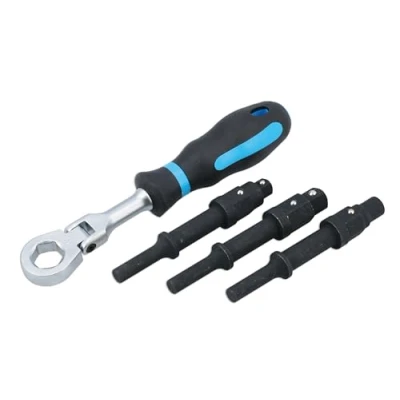 Allows the application of impact & torque for loosening of tight or corroded fixings. Adaptors to allow connection to: 3/8"D & 1/2"D socketry, 5/16" shank hex bits. Includes 19mm flexi-head gear wrench. Manufactured from chrome vanadium. Designed to be used with impact quality sockets & bits. For use with Laser air hammer (Part No. 6031) or equivalent. Presented in a EVA foam organiser tray (33 x 170 x 238mm).