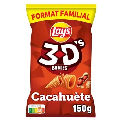 LAY'S 3D BUGLES PEANUT FLAVOR, A GOURMET SNACK: Delicious crispy corn cones with an irresistible peanut flavor. The salted soufflé biscuit that suits all tastes! THE PERFECT BISCUIT BOUFFLE FOR THE APERO: For more delicacy and flavours, immerse Lay's 3D's in your favorite sauce: guacamole, fresh cheese, tzatzíki, … it's the guarantee of a successful aperitif! SNACKS TO ENJOY EVERY DAILY MOMENT: For an aperitif, at a picnic, at a summer barbecue or on the go to complete a sandwich: Lay's 3D accompanies you at each of these moments with its appetizer cookies with delicious flavors! DISCOVER THE ENTIRE OF OUR LAY'S 3D RANGE: To please the whole family, Lay's 3D's offers a wide choice of flavors: Nature, Bacon, Cheese, Peanuts, Goat, Paprika and Ham Cheese LAY'S 3D QUALITY, A PRIORITY: Since 2021, Lay's 3D's has been offering you a recipe without preservatives, colourants or artificial flavours for its flagship Lay's 3D's nature and bacon references! This initiative is part of our continuous improvement of our recipes, in order to offer products combining pleasure and quality