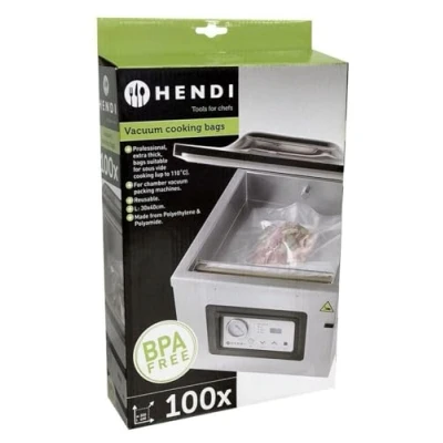 The vacuum bags from Hendi are specially made for use in sous vide systems. These vacuum packaging bags are made of top quality plastics that can withstand higher temperatures. When you use genuine Hendi vacuum packaging bags you can be assured that your dishes will retain their aroma and full flavor. * Especially for use in combination with the sous vide system * 2-layer bags * Inner layer of Polyethylene is suitable for food contact and is 60 µm * Outer layer of Polyamide (Nylon) is 15 µm * Total thickness 75 μm * The materials used act as a UV filter. The bags can be used at temperatures from -20˚ to 110˚C * Suitable for vacuum chamber packaging machines These vacuum chamber bags are not suitable for Foodsavers.