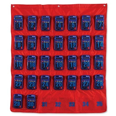 Convenient calculator storage chart. Keep calculators organized and ready for students Features metal grommets for hanging Holds up to 35 calculators in clear numbered pockets. Also great for cell phones! Perfect for the classroom