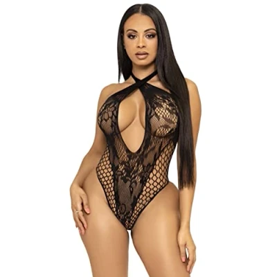 Leg Avenue Lace and net Halter Teddy, O/S(Black)