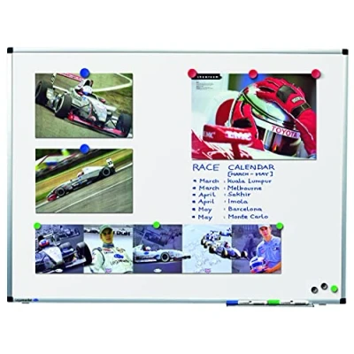 Lacquered steel surface with a special coating. Easy wall mounting with concealed slot system. Can be mounted either horizontally or vertically. Suitable for writing on with dry wipe board markers. Aluminium frame with dark grey plastic corner caps. Comes complete with fixing kit, marker tray and board marker.