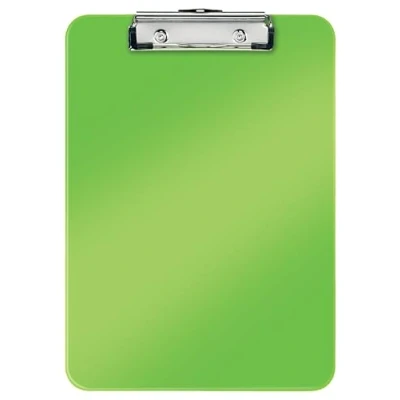 Green clipboard with a glossy finish, contemporary design with round edges, holds up to 80 A4 sheets, easy to handle ergonomic shape, for home and office use Strong metal clip with rubber grip on top holds and secures papers, easy to transport loose documents on the move, space efficient storage: Retractable hook for hanging on walls or bulletin boards Brighten up your desk with this and other products from the Leitz WOW range High-quality plastic for an elegant look that lasts, easy to clean, smooth surface Contents: 1 x Leitz A4 clipboard, green, WOW, dimensions: (W x H x D) 228 x 17 x 320 mm, 39710054