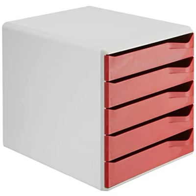 Five-drawer cabinet with red drawers and light grey housing for organising and storing A4 size documents, pens, makeup, cables, kitchen utensils, medicine or remote controls for home or office use Five drawers for A4 documents, drawers stay shut with one push and stop mechanism prevents them from falling out Ergonomic cut-out handles for easy open/close, quick identification and retrieval of contents with the easy to write snap-on label holders supplied Mix and match with other products from the Leitz post range, stack up to three for maximum space efficiency, rubber feet on bottom keeps cabinet from slipping, made of plastic for an elegant look that lasts, smooth, easy to clean surface Contents: One Leitz A4 Drawer Cabinet, 5 Drawer Organiser, dimensions (W x H x D): 35.5 x 28.5 x 29 cm, weight: 3.15 kg, material(s): Plastic, colour: Red, post set, 52800025