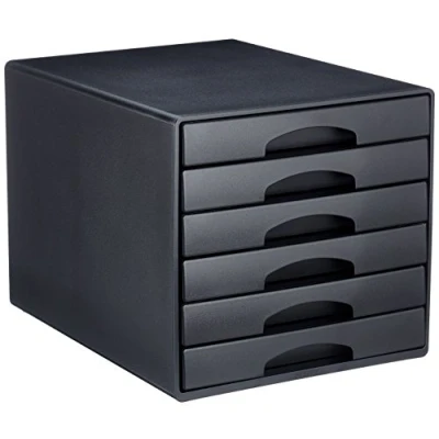 Six-drawer black cabinet with a matte finish for organising and storing A4 size documents, pens, makeup, medicine or remote controls for home or office use Individual drawer height: 3.4 cm, drawers have finger holes on the front making them easy to open and close, stop mechanism prevents drawers from falling out, snap-on label holders with replaceable labels for quick identification and retrieval of contents Mix and match with other products from the Leitz post range for the an ideal office look Stack up to three on top of each other to save space, rubber feet on bottom keep cabinet from slipping, made of durable plastic for a elegent look that lasts, smooth, easy to clean surface Contents: One Leitz A4 Drawer Cabinet, 6 Drawer Organiser, dimensions (W x H x D): 28.7 x 36.3 x 27 cm, weight: 3.52 kg, material(s): Plastic, colour: Black, plus range, 52120095