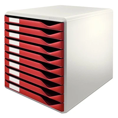 Ten-drawer cabinet with bordeaux drawers and light grey housing for organising and storing A4 size documents, forms and files for home or office use Ten drawers for A4 documents, drawers stay shut with one push and stop mechanism prevents them from falling out Ergonomic cut-out handles for easy open/close, quick identification and retrieval of contents with the easy to write snap-on label holders supplied Mix and match with other products from the Leitz post range, stack up to three for maximum space efficiency, rubber feet on bottom keeps cabinet from slipping, made of plastic for an elegant look that lasts, smooth, easy to clean surface Contents: One Leitz A4 Drawer Cabinet, 10 Drawer Organiser, dimensions (W x H x D): 35.5 x 28.5 x 29 cm, weight: 3.85 kg, material(s): Plastic, colour: Bordeaux, form set, 52810028