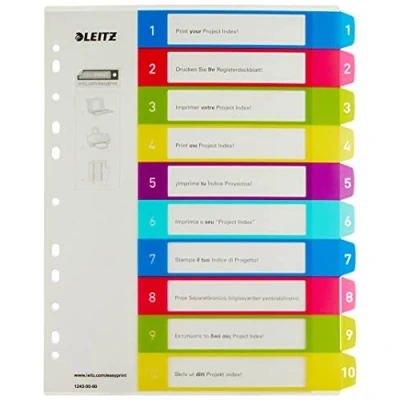 Amazon1-10 index for the clear organisation of A4 documents, helps in keeping track of important notes or school paperwork, for home, school or office use Won’t cover tabs when used with punched pockets thanks to extra wide A4 maxi format, coloured tabs for clear classification of documents, universal punched filing strip for easy filing in all types of binders and files Easy to update index by hand or using Leitz easyprint templates Brighten up your desk with this and other products from the Leitz WOW range, wipe clean plastic surface is durable and tear resistant Contents: One A4 WOW 1-10 index, extra wide, plastic, 12430000, W x D x H: 24.5 x 0.3 x 30.5 cm, colour - white/multi-coloured; weight: 0.23 kg