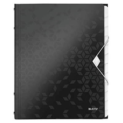 A4 black divider book, expands from 1.5 to 3 cm, holds up to 200 A4 sheets 80 gsm, ideal for the transportation and organisation of documents for school or office use Integrated index with 12 labels to clearly identify contents, three flaps inside stop loose pages falling out, easy to write on label, elastic closure is quick to open and keeps documents safe Brighten up your desk when you mix and match with other products from the Leitz WOW range Dual colour effect, wipe-clean plastic surface, durable and tear resistant Contents: 1 x Leitz A4 Divider Book, dimensions (W x H x D) 26 x 1.7 x 32 cm, materials: Flexible plastic, colour: Black, 46340095