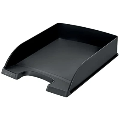 A4 letter tray in black with a matte finish for the organisation of A4 documents, magazines and folders with easy to handle ergonomic shape Can be stacked vertically or stepped to allow simple organisation of documents and magazines with high side walls for larger than average capacity, Interior dimensions: 24.2 x 6 x 33 cm Sturdy plastic material with space saving design does not bend when full and has a front slope for easy retrieval of documents, ideal for the home, office or school Keep a clean desk with this and other products from the Leitz Plus range, use alone or in combination with Leitz Plus standard, slim and jumbo letter trays for flexible storage solutions Contents: 1 x Leitz Plus Standard Letter Tray, A4, Dimensions (W x H x D): 25.5 x 3.5 x 35.7 cm, Black, Plus Range, 52270095