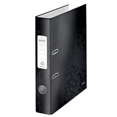 AmazonMulti-use Lever Arch file in black, 50mm wide spine, holds 350 sheets (80 gsm paper, for easy handling of documents on the move and in the office Robust and sturdy grey cardboard covered with a glossy laminated paper that gives a high quality look and feel, FSC Certified, Thumbhole for easy handling, Stylish glued spine Label and dual colour cover 50% wider opening and 20% quicker double sided filing thanks to patented 180° Lever Arch mechanism, Mechanism guaranteed for 5 years, Rado slots to keep binder closed and upright on shelf Brighten up your desk with this and other products from the Leitz WOW range Contents: 1x Leitz Lever Arch file, Black, 10060001, dimensions (WxHxD: 52x318x285mm, 430g, for Standard 2-hole punching