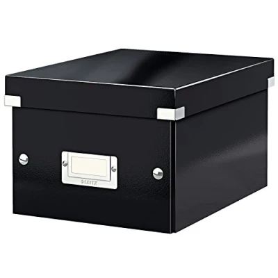 A5 storage box in black, holds A5 sized documents and other small items such as office stationery, cables, photos and more, contemporary design, ideal for the transportation and organisation of documents and assorted accessories at home or in the office Simple assembly and disassembly with clothes popper fastening construction, folds away for easy storage when not in use Durable material for reusable storage, label holder on front for easy content indexing Mix and match with other products from the Leitz click and store range, high quality, reinforced metal corners for keeping documents safe, laminated surface for easy cleaning Contents: 1 x Leitz Click and Store Small Box, Black, 60430095; (W x D x H) 22 x 28.5 x 36.7 cm, A5