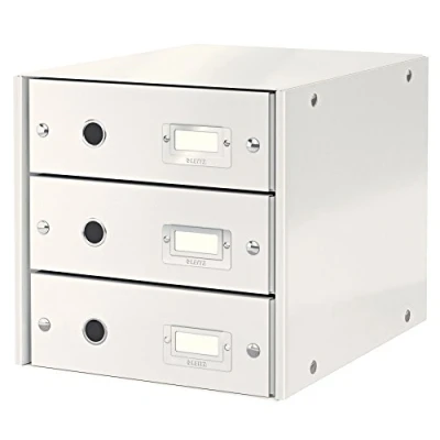 Three drawer cabinet in white, holds up to 800 A4 documents in each drawer, contemporary design, easy handling with metal thumb hole on each drawer, ideal for the storage and organisation of documents and assorted accessories at home or in the office Simple assembly and disassembly with clothes popper fastening construction, folds away for easy storage when not in use Durable material for reusable storage, label holder on each drawer for easy content indexing Mix and match with other products from the Leitz click and store range, high quality, laminated surface for easy cleaning Contents: 1 x Leitz Click and Store Drawer Cabinet, Three Drawers, White, 60480001; (W x D x H) 28.6 x 28.2 x 35.8 cm, A4