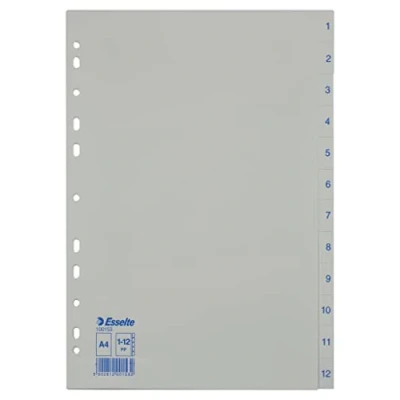 AmazonIndex 1-12 for clear organisation of A4 documents, ideal for use with binders or ring binders. white dividers and tabs with blue numbers for organising documents, practical universal perforation for filing in ring binders and binders. Optimal order for home and office RPA2023202023. 3Robust and durable durable and durable Sheets made of polypropylene plastic for optimal organisation for home and office Package contents: 1 x Esselte dividers for order A4, plastic, dimensions (W x H x D): 22.5 x 29.7 x 0.2 cm, colour: blue/white, 100153
