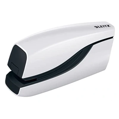 AmazonElectric stapler for up to 10 sheets 80 gsm paper for home, school and office use, uses e1 staples Staples: e1 staples 4 mm leg length fasten up to 10 sheets of paper Space-saving: Fits on every desk and most drawers thanks to its compact size, anti-slip feet won’t mark furniture, integrated staple remover, battery powered for on the go use (battery not included Brighten up your desk with this and other products from the Leitz Wow range, 3 years guarantee, no staple jams, front opening for easy refilling, ergonomic shape for one handed stapling, GS Safety Tested Contents: 1 x Leitz Electric Stapler WOW range, white, 55661001, dimensions (W x H x D) 50 x 66 x 154 mm, Weight: 219 g