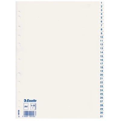 AmazonIndex 1-31 for clear organisation of A4 documents, ideal for use with binders or ring binders White dividers and tabs with blue numbers for organising documents, practical universal perforation for filing in ring binders and folders Optimal order for home and office Robust and durable dividers made of polypropylene plastic and cover sheet made of 250 g/m² cardboard for optimal order for home and office Box contents: 1 x Esselte dividers for order A4, plastic, dimensions (W x H x D): 22.5 x 29.7 x 0.4 cm, colour: blue/white, 100144