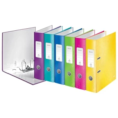 Multi-use lever arch file in assorted colours, 80mm wide spine, A4, Holds 600 sheets (80 gsm paper), For frequent home, school or office use Robust and sturdy grey cardboard covered with a glossy laminated paper that gives a high quality look and feel, FSC Certified, Thumbhole and rado rings for easy handling, Stylish glued spine label and dual colour cover 50% wider opening and 20% quicker double sided filing thanks to patented 180° lever arch mechanism, Mechanism guaranteed for 5 years, Rado slots to keep binder closed and upright on shelf Brighten up your desk with this and other products from the Leitz WOW range Contents: 1x pack of 10 Leitz Lever Arch Files, Assorted colours, 10051099, Dimensions (WxHxD): 80x318x285mm, 480g each, A4, for Standard 2-hole punching