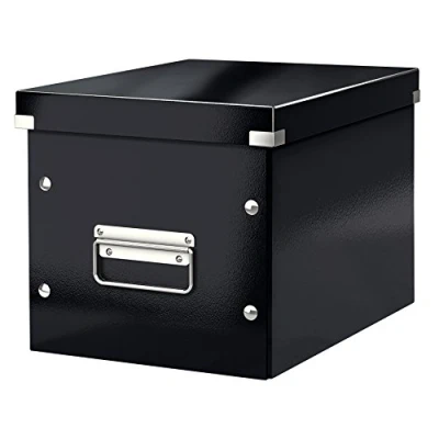 123inkThe Leitz 6109 Click & Store Cube medium storage box fits perfectly on the shelves of a standard cupboard (e.g. the Billy cupboard). This storage box offers plenty of space, so you can also store round or tall objects in it. With it's sleek, black colour and glossy finish, this storage box will blend in beautifully with your interior. The cardboard is finished with laminated PP film. Sturdy metal handles complete the design. The storage box can be assembled with a few push buttons and can also be folded completely flat.