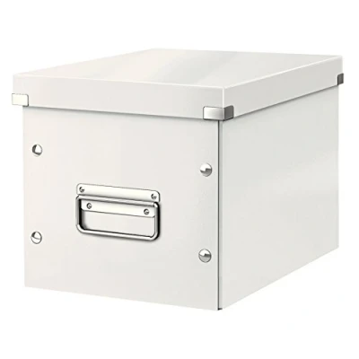 123inkThe Leitz 6109 Click & Store Cube medium storage box fits perfectly on the shelves of a standard cupboard (e.g. the Billy cupboard). This storage box offers plenty of space, so you can also store round or tall objects in it. With it's white colour and glossy finish, this container blends in beautifully with furniture. The cardboard is finished with laminated PP film. Sturdy metal handles complete the design. The storage box can be assembled with a few snaps and can also be folded completely flat.