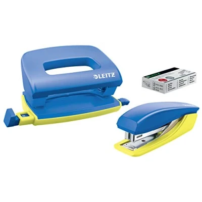 Mini stapler and hole punch set in blue, sleek and compact design for school and home office use Stapler for up to 10 pages at once with built-in staple remover, 1000 P2 No. 10 staples included, 180 degrees opening enables nailing function Hole punch for up to 10 pages at once, four hole punching in position 888 of guide bar which also provides the option for diverse paper sizes (A4, A5, A6, folio, US-quart), ergonomic grip area for comfortable punching, integrated confetti collection tray 3-year guarantee and GS safety tested, mix and match with other products from the Leitz Urban Chic range Content: 1 x Leitz Mini Stapler and Hole Punch Set, 1000 N°10 staples included, Blue, 55996032, Dimensions (W x H x D): 150 x 56 x 200 mm, Urban Chic Range