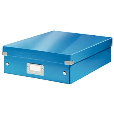 AmazonOrganiser storage box in blue, removable dividers allow you to divide the box in two or four compartments for effective storage, contemporary design, ideal for the storage and organisation of cables, stationery and other office accessories, for home or office use Simple assembly and disassembly with clothes popper fastening construction, folds away for easy storage when not in use Durable material for reusable storage, label holder on front for easy content indexing Mix and match with other products from the Leitz click and store range, high quality, reinforced metal corners for keeping contents safe, laminated surface for easy cleaning Contents: One Leitz click and store medium organiser box, blue, 60580036; W x D x H: 28 x 10 x 37 cm