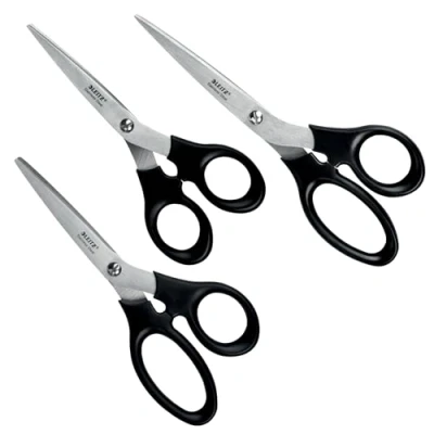Stainless steel scissors designed for all standard paper cutting tasks Essential accessory for every drawer in the office or at home With ergonomic grip for easy handling, 3 pairs of scissors sizes: 165/185/200 mm Suitable for right- and left-handed use 5-year guarantee, plastic-free hanging card packaging