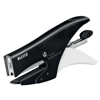AmazonStapling pliers for up to 15 sheets 80 gsm paper for home, school and occasional office use, uses N°10 staples Staples: N°10 staples fastens up to 15 sheets of 80 gsm paper, also works with Leitz white staples which are invisible when photocopied Space-saving: Fits on every desk and most drawers thanks to its compact size, paper insertion depth 49.5 mm Brighten up your desk with this and other products from the Leitz Wow range, 10 years guarantee, ergonomic handle for comfortable use, back loading makes it easy to refill Contents: 1 x Leitz Stapling Pliers WOW range, Black, blister packaging, 55311095, dimensions (W x H x D) 24 x 82 x 160 mm, Weight: 290 g, includes: Staples N°10